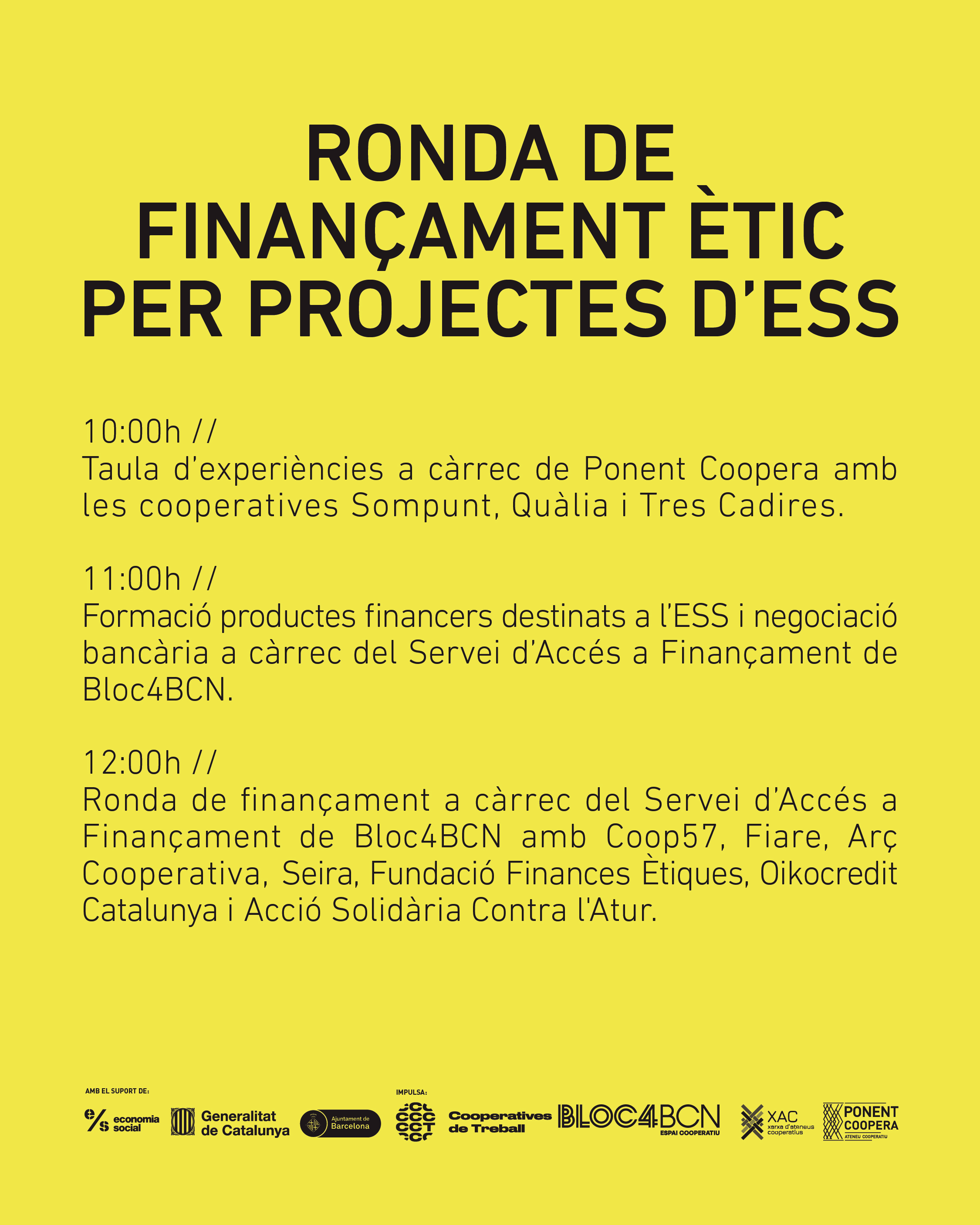 El conjunt de la jornada està coorganitzada per Ponent Coopera, l’Ateneu Cooperatiu de les terres de Lleida, i el Servei d’Accés a Finançament de Bloc4BCN, impulsat per la Federació de Cooperatives de Treball de Catalunya.